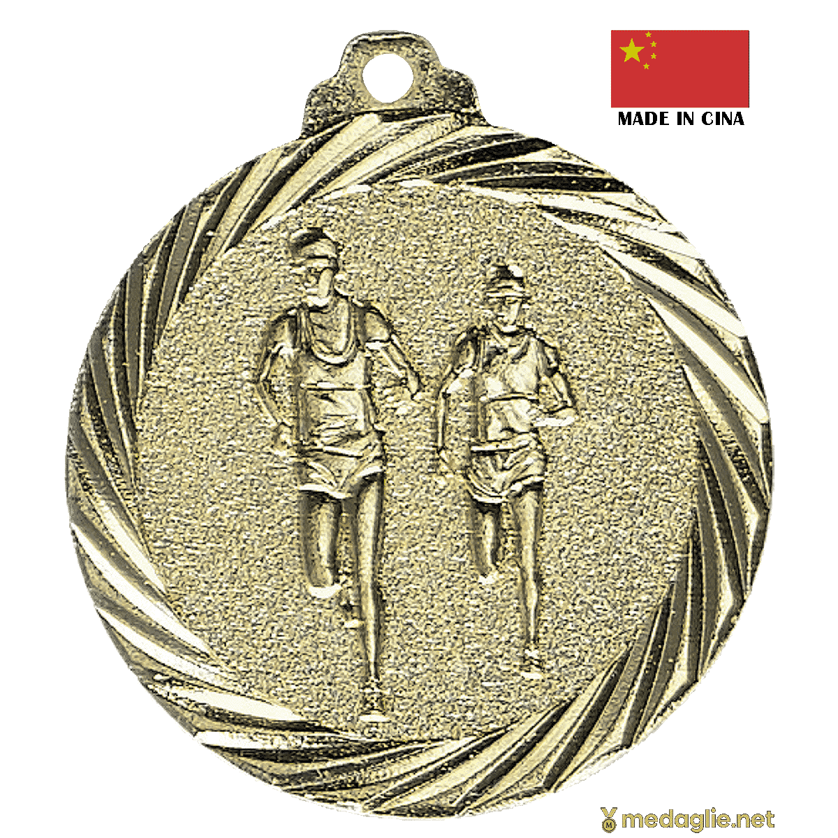 Realizzata in metallo con finitura color oro, la medaglia ha un diametro di 32 mm, dimensione ideale per un premio elegante, leggero e facilmente indossabile durante le cerimonie di premiazione. Il fronte è coniato con immagini dedicate all’atletica leggera e al podismo, mentre il retro è completamente personalizzabile con testo o immagine, senza incisione.