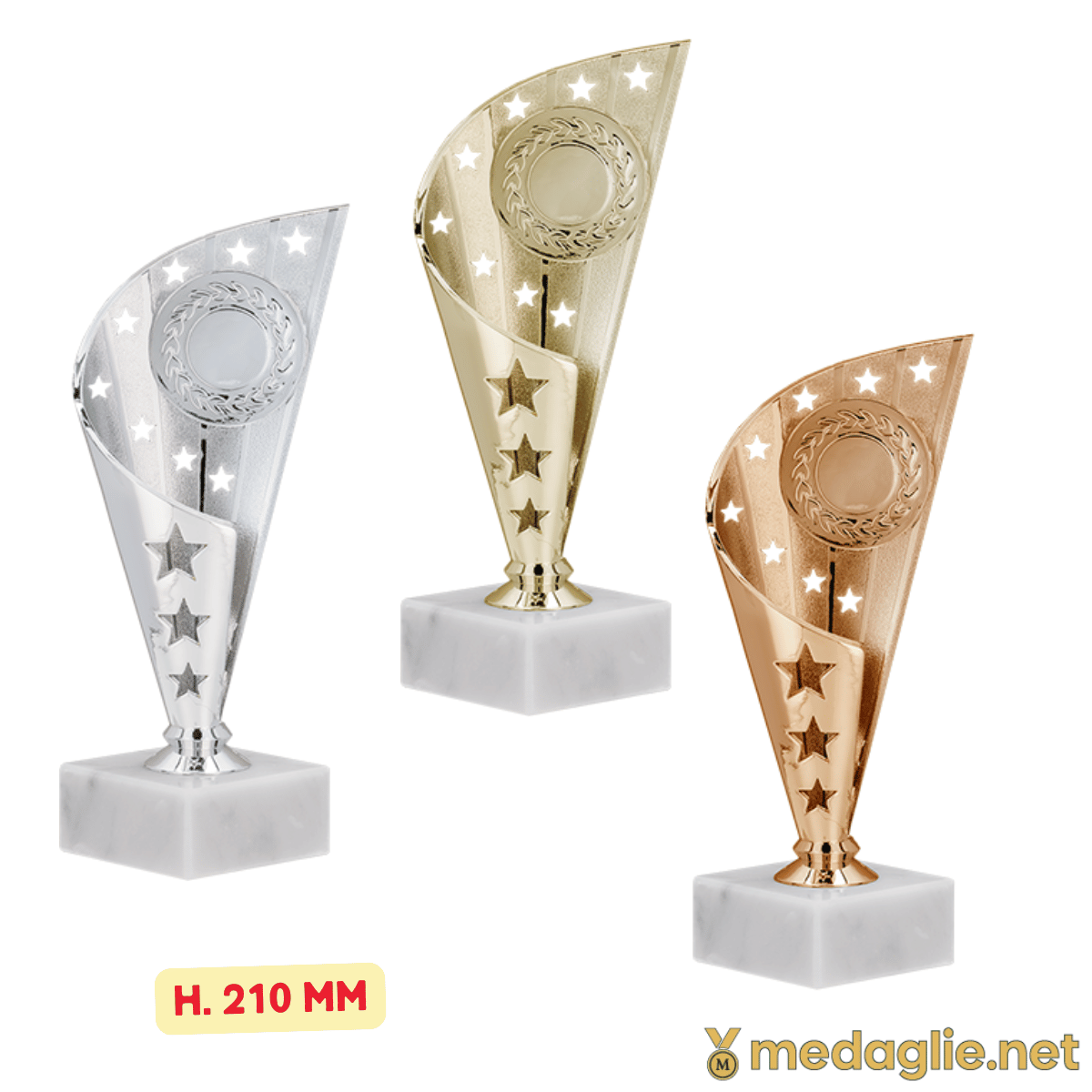 Set di coppe premiazioni economiche in oro, argento e bronzo alte 22 cm, realizzate in ABS leggero e resistente. Perfette per eventi sportivi, competizioni scolastiche e manifestazioni, sono personalizzabili con targhetta inclusa nel prezzo. Possibilità di acquisto singolo o in set completo per ogni esigenza.
